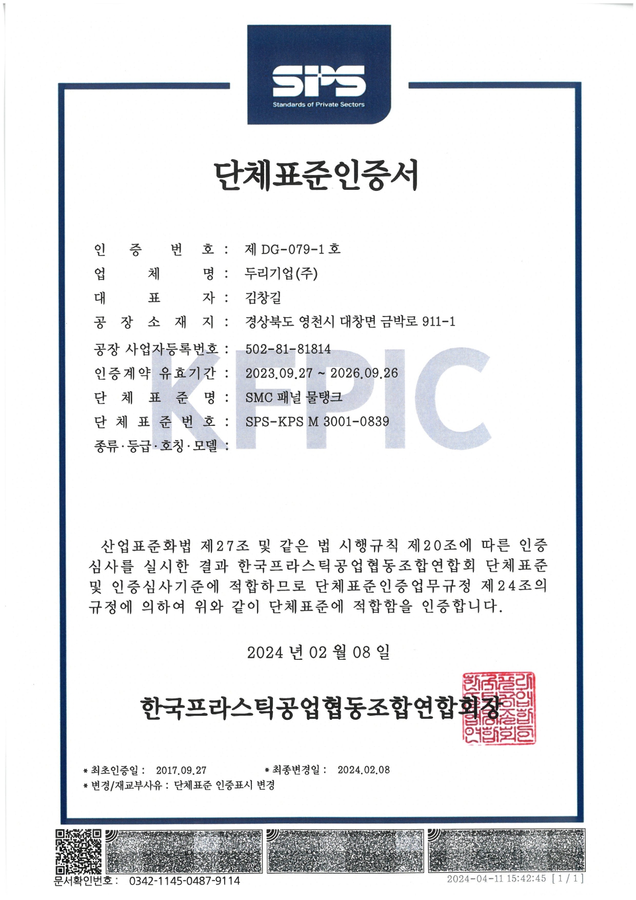 단체표준인증서(SMC 패널 물탱크)