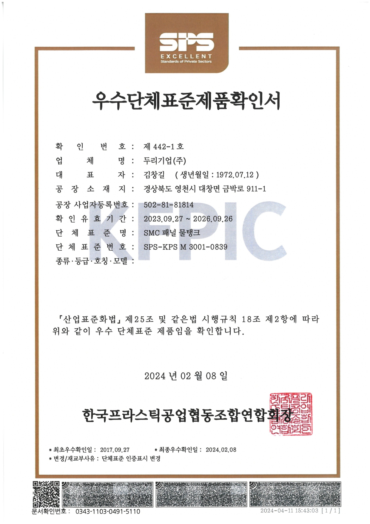 우수단체표준제품확인서(SMC 패널 물탱크)